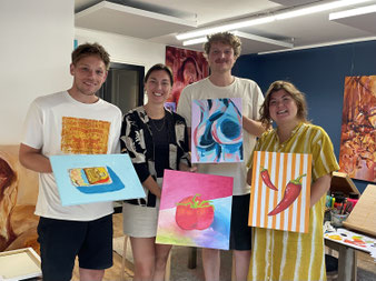 Wanneer de schets je voldoende houvast biedt is het tijd om te schilderen. Je kiest verschillende kleuren acrylverf en stelt je palet samen. Je krijgt begeleiding bij het gebruik van verschillende technieken en het kiezen van de juiste penselen. Na 2.5 uur is jouw kunstwerk klaar en kan je deze direct meer naar huis nemen.